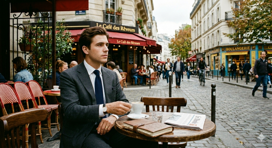 La escena parisina es inconfundible. Imagina una mesa redonda, un cuaderno abierto junto a una taza humeante, el viento moviendo ligeramente el bajo del abrigo mientras el nudo de la corbata permanece firme.