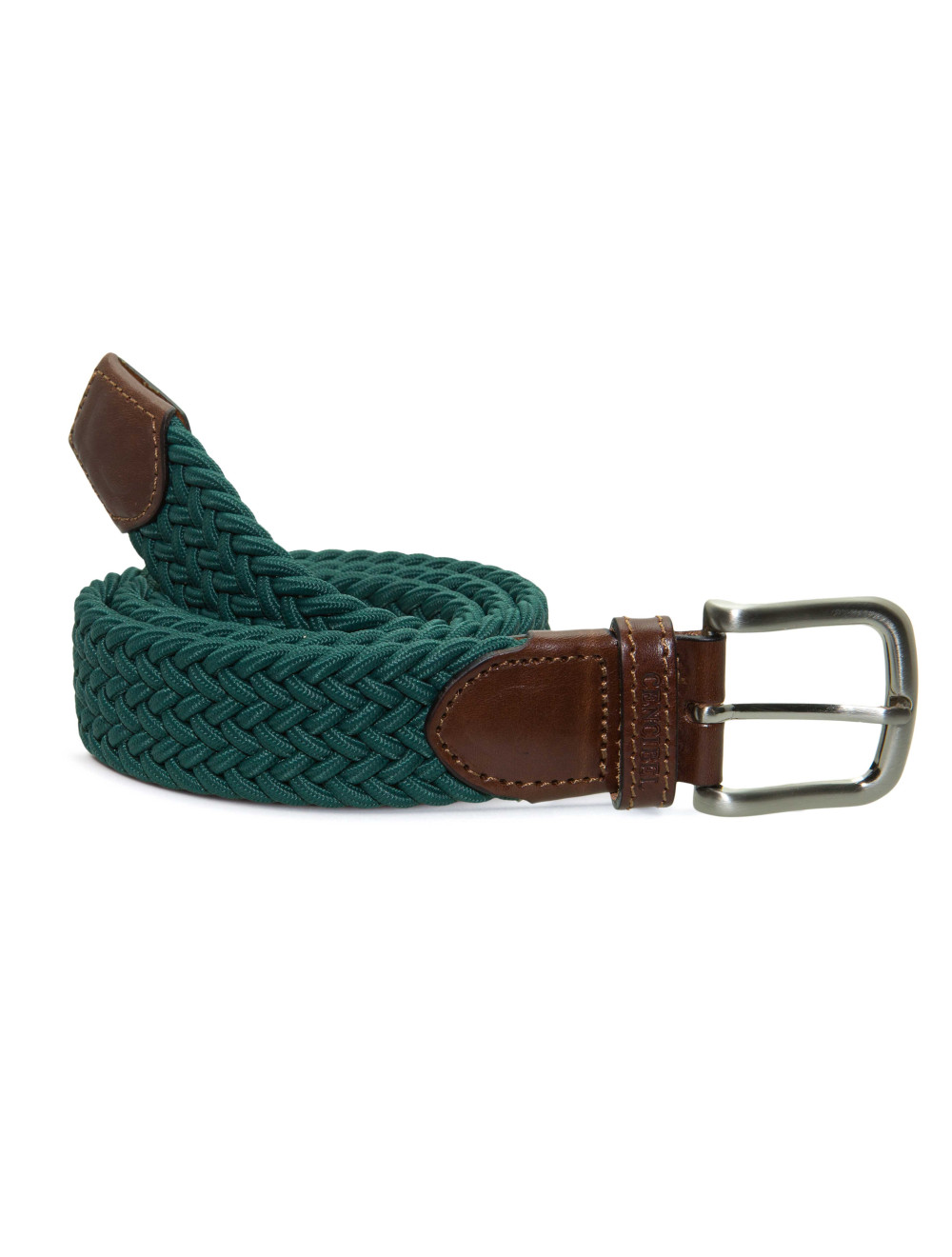 Cinturón elástico color verde combinado con piel de vacuno en la puntera y en la hebilla. La anchura del cinturón es de 35mm.