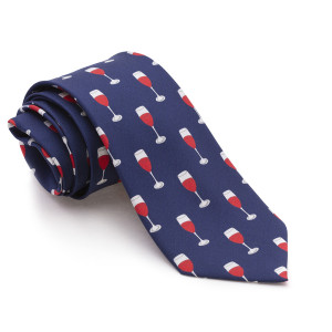 Corbata 100% seda natural estampada de color azul marino con dibujos de toneles de vino y racimos de uvas.