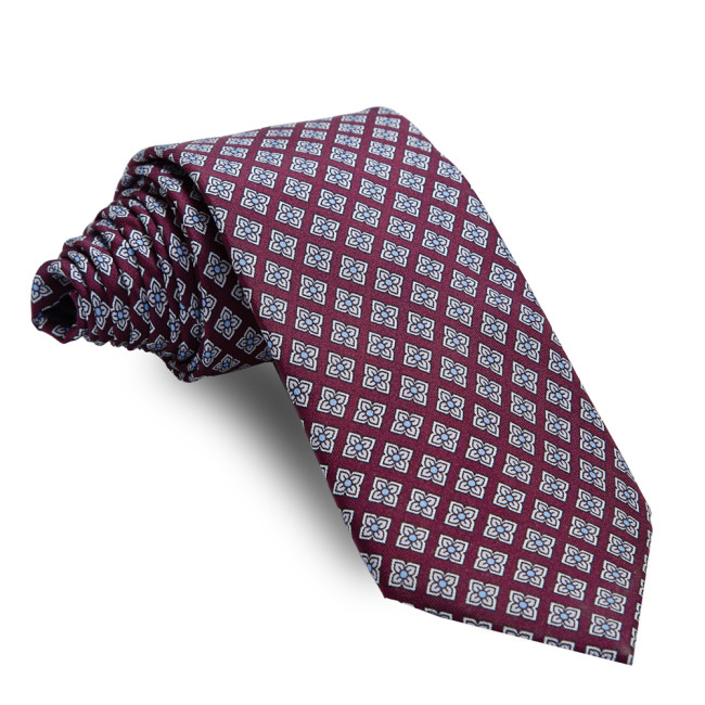 Corbata 100% seda natural estampada de color burdeos o granate con pequeños dibujos corbateros en gris y celeste.