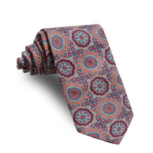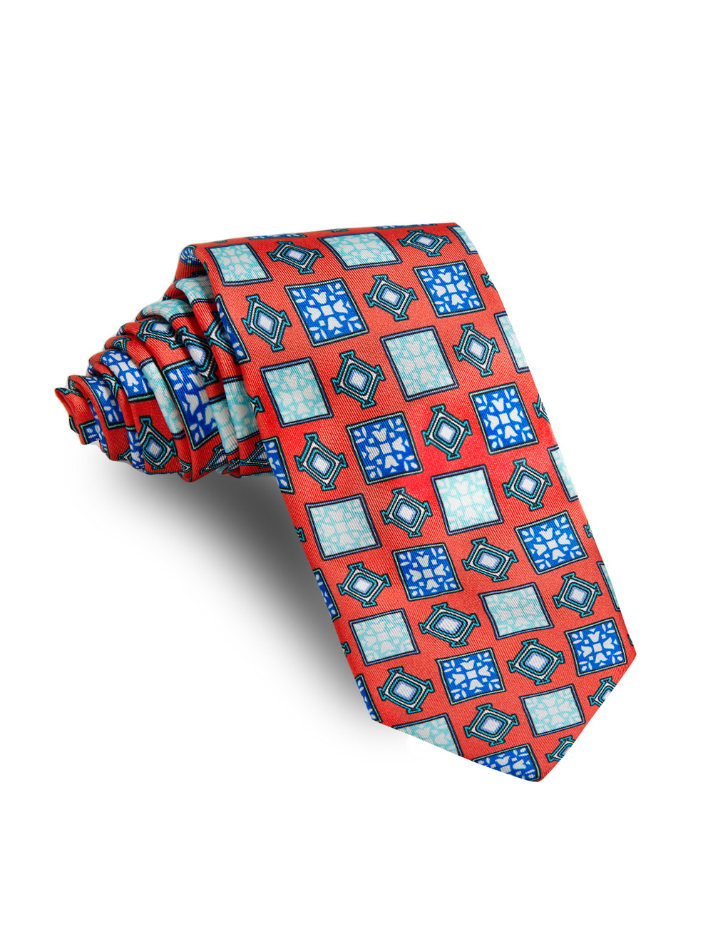 Corbata 100% seda natural estampada de color coral con dibujos geometricos verde agua, azules y blancos.