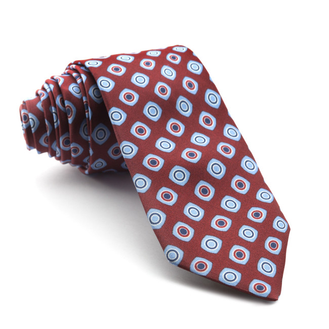 Corbata 100% seda natural estampada de color burdeos con dibujos en celeste.